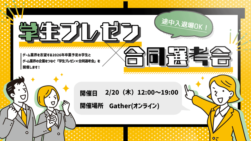ゲーム業界を志望する2026年卒業予定の学生とゲーム業界の企業をつなぐ「学生プレゼン×合同選考会」を開催します!